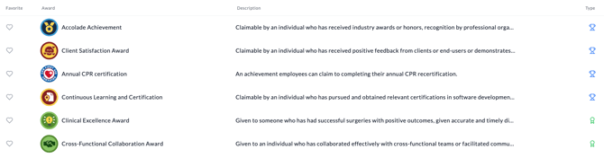 Each award in the catalog has a title, description, and award type (achievement (trophy icon) - if you have achievements available, or manual award (badge icon)). You can also easily favorite awards.