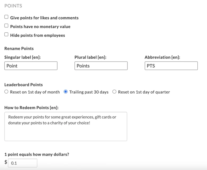 Admins can configure whether likes and comments are enabled and whether they award points.