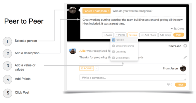 Recognition activity appears in the platform feed and helps create visibility across teams.
