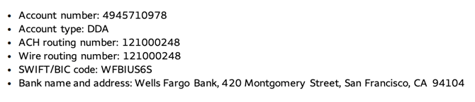 | Beneficiary Bank | Wells Fargo Bank 420 Montgomery Street San Francisco, CA 94104 |