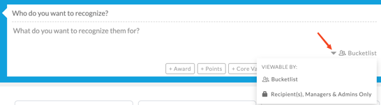 If you would like to provide out a private recognition, that would not appear on the activity feed, you can do so by clicking the dropdown menu at the far right of the recognition box "company name" and choose "Recipient(s), Managers & Admins Only".