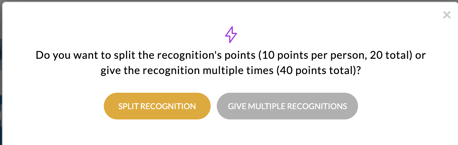 - If you are recognizing multiple people, and add points, a pop-up will appear when you post the recognition asking if you would like to split the points or give the recognition points multiple times.
