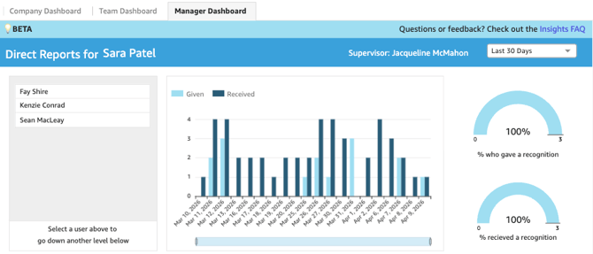 The Manager dashboard will display recognition data for direct reports for the person viewing the insights dashboard. You can drill down to direct reports of your direct report in the below section.