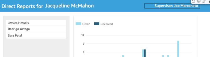 - eg. click into direct reports for Jacqueline, see her direct reports below of Jessica, Rodrigo and Sara and their recognitions given/received.