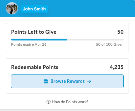 The points panel displays your points left to give, when they expire, and how many of your points you have given in this time period. It also displays your redeemable points total, and allows easy access to redeem these points, by clicking "Browse Rewards".