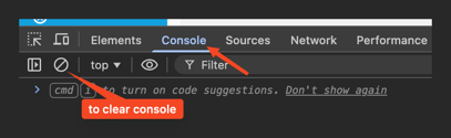 - We usually will want to see the "console" tab of these tools, and you can click 🚫 to clear the console before retrying your issue.