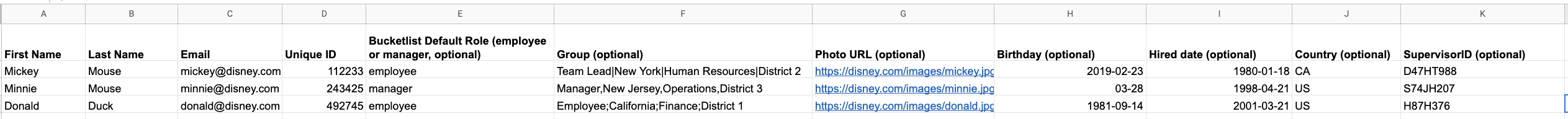 "Minnie",Mouse","minnie@disney.com","02016319","Employee|Operations|California","2000-04-01","02013661"